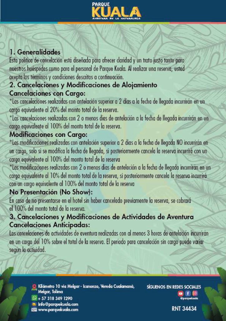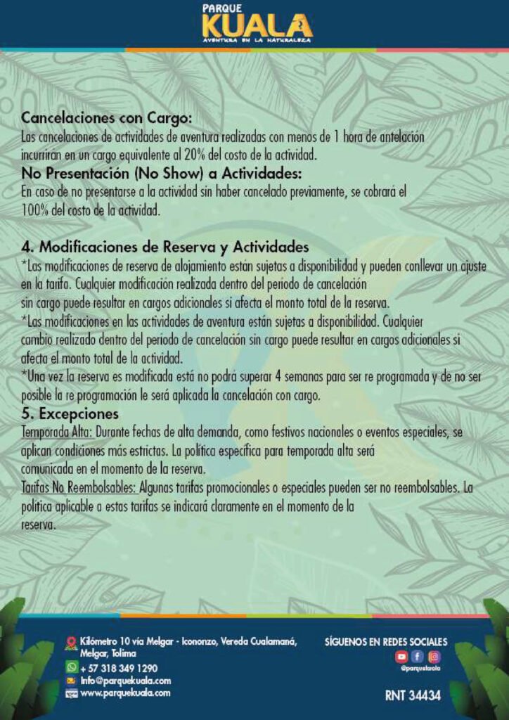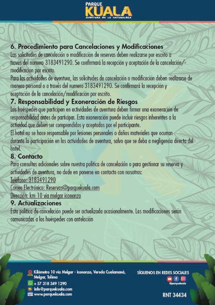 El área responsable de atender las peticiones de acceso, rectificación, actualización, supresión de datos o revocatoria del consentimiento o autorización otorgada para el tratamiento de sus datos personales, es la oficina de Servicio al Cliente, correo electrónico ecoparquekualamelgar1@gmail.com, página web www.ecoparquekualamelgar.com.co